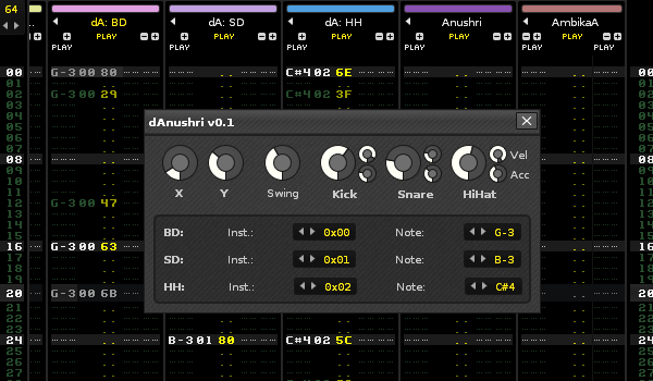 - Velocity values are handled in a different way, with dAnushri you can adjust the impact of the ‘importance’ of a hit freely with the small “vel” knob