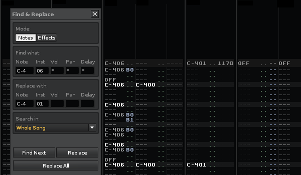 A tool for finding & replacing raw pattern data (notes, instruments, fx, …). Has simple wildcard support and the ability to batch replace all occurrences. Shows up as ‘Find And Replace…’ in the Pattern Editor’s context menu.