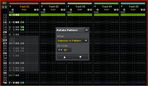 Creates a new menu entry ‘Rotate…’ in the Pattern Editor’s context menu. Also adds Pattern Editor shortcuts to quickly rotate selection content up and down.