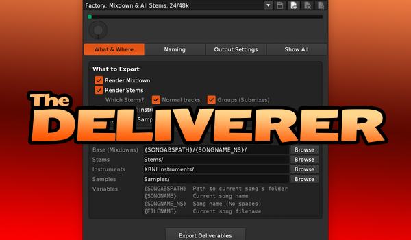 Batch rendering and archival tool for collecting mixdowns, stems, Renoise instruments, and raw samples, with customizable destination folders, export formats, and flexible naming for stems and mixdowns.
