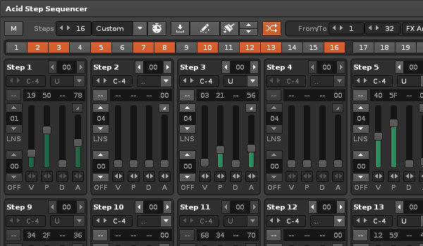 The Acid Step Sequencer is a step note injection tool. It allows you to insert note parameters and their effects easily, focused on the progression of acid steps.
