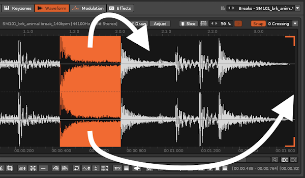 Includes three key command functions to clone/paste the sample selection continuously, behind the selection, or at the end of the audio waveform. Simply select part of the audio waveform and use the associated key command. You can also combine it with [CTRL+C] and [CTRL+V].