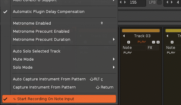 "Start Recording On Note Input" or "STN" starts recording notes from the first input note with follow the player's position in the pattern. It will start recording from the selected line. - Go to "Renoise/Options:~ Start Recording On Note Input" to enable/disable it.