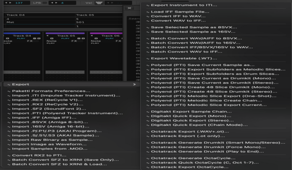 Import (Octatrack, Polyend Tracker, .REX, .RX2, .SF2, .PTI, .ITI, .IFF, .8SVX, .16SV, .WT, .SFZ, Images, 4channel modules, Akai S1000/S3000, Raw Binary), Export (Octatrack .ot files + Drumkits + OctaCycle, Digitakt Sample Chains, Polyend Tracker .PTI + Drumkits + Melodic Slices, .IFF, .8SVX, .16SV, .ITI, .WT) + Batch Conversions + Drumkit Generators