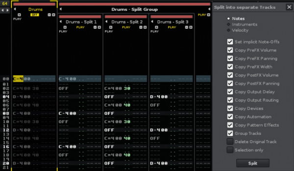 This tool splits the notes of one single track into separate tracks according to either the note columns, note values, instrument values or volume values. Normal note-offs as well as (optionally) "implicit" note-offs (when a note stops a former one) are set in the newly created tracks. The new tracks are named according to the track they were split from and (optionally) put into a group, together with the original track. Volume, panning, delay and (optionally) effect column values as well as (optionally) track volume (pre and post), panning (pre and post), width, output delay, output routing, devices and automation are copied as well (when tracks are put into a group, effect columns as well as track volume (pre and post), panning (pre and post), width, output routing, devices and automation will be copied to the group track only). This tool will process the whole track or optionally just a selection.